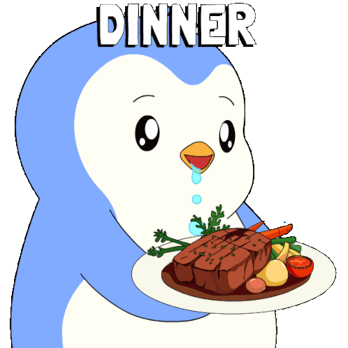 a cartoon of a penguin holding a plate of food with the word dinner below it