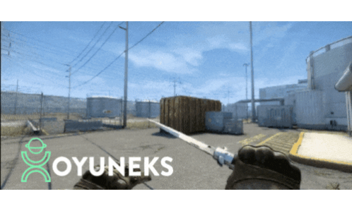 a person holding a knife in front of a building with the words oyuneks on the bottom