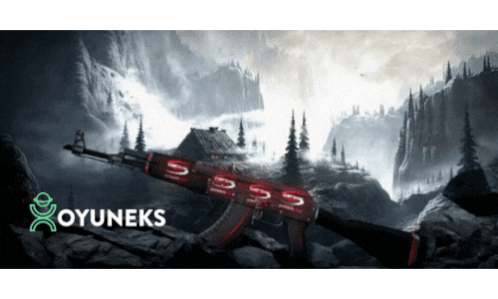 an advertisement for oyuneks shows a rifle in front of a mountain