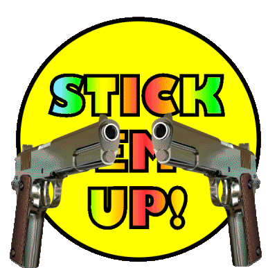 A vibrant animated sticker featuring the phrase 'STICK 'EM UP!' in rainbow colors, flanked by two pistols, suggesting a 'hands up' command.