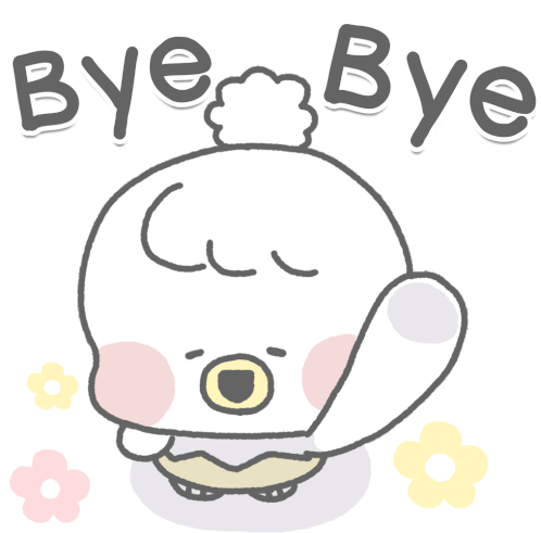 Cute chick character Piyomaru waves goodbye with a gentle expression, surrounded by small pastel flowers.