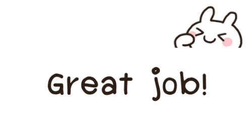 A cute rabbit celebrates with confetti, saying 'Great job!' and 'お疲れ様' to congratulate someone.