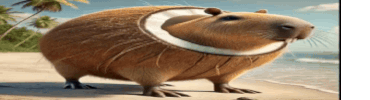 버발로니 로리 댄스 슬록스, a capybara with a coconut shell, transforms into a buff version on the beach.