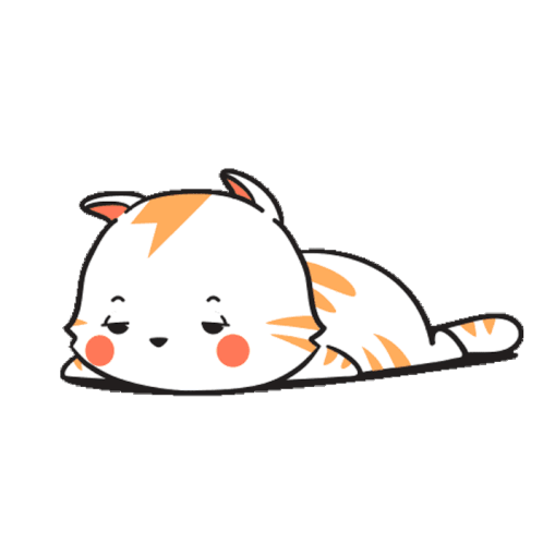 A cute cartoon cat with orange stripes is lying down, looking sleepy and tired, making a grumpy face.