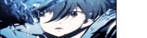An anime character's intense gaze through shimmering blue water, reflecting a mysterious and beautiful melody.