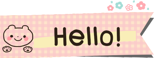 A cute cartoon bear, possibly Quan, waves next to 'Hello!' on a pink checkered background with flowers.