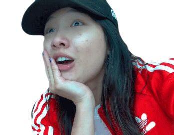 A woman, softpomz, wearing a red Adidas jacket and black cap, makes a wide-eyed, surprised face with her mouth open.