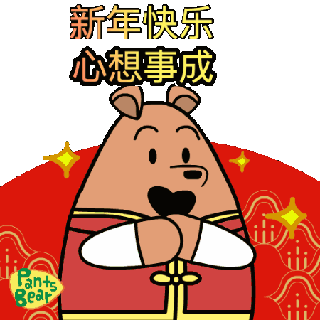 A cute Pants Bear in traditional Chinese attire wishes "Happy New Year" and "May all your wishes come true."