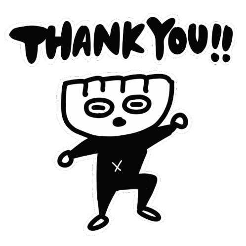 A cute animated dumpling monster wiggles and expresses gratitude with the words 'THANK YOU'.