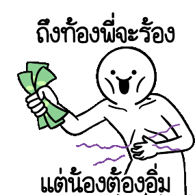 A stick figure character holding money, showing self-sacrifice with a rumbling stomach, saying 'Even if my stomach growls, you must be full.'
