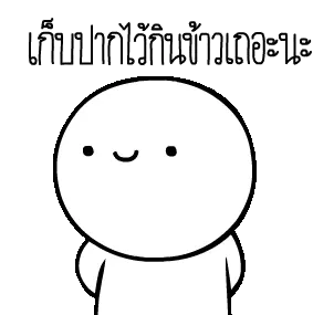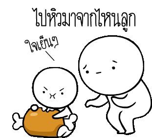 A round-headed character hungrily devours a fried chicken leg, while another character advises them to calm down.