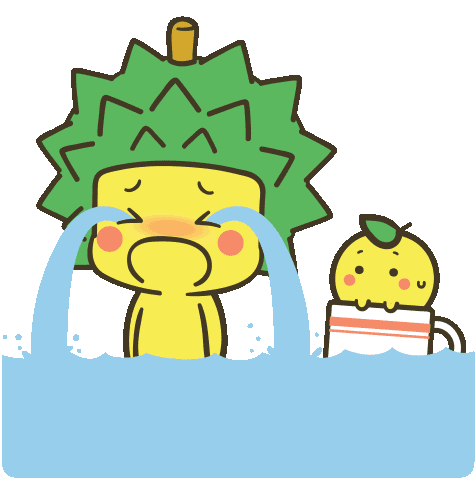 Durein Durian, the durian-headed character by Chow Hon Lam, crying hysterically with a flood of tears.