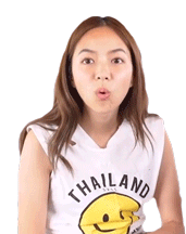 a woman wearing a thailand shirt with a smiley face on it is making a funny face .