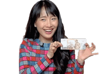 a woman in a plaid shirt is smiling and holding a piece of paper in her hand .