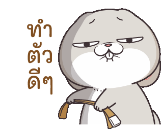 A cute rabbit character taps with a sparkle, then turns to give a stern look with the message "Behave well."