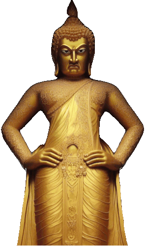 a golden statue of a buddha standing with his hands on his hips