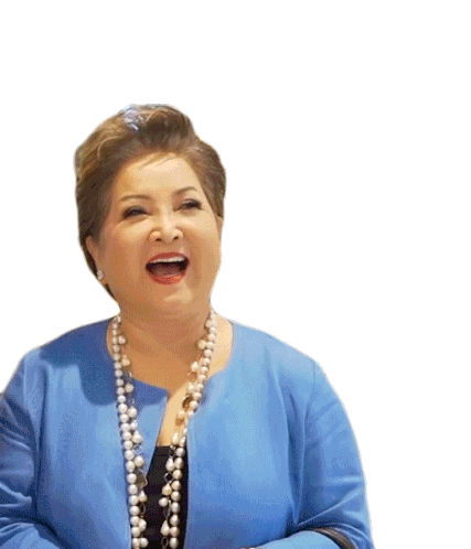 a woman wearing a blue jacket and a pearl necklace is laughing
