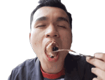 a man is eating a piece of meat with a spoon .