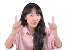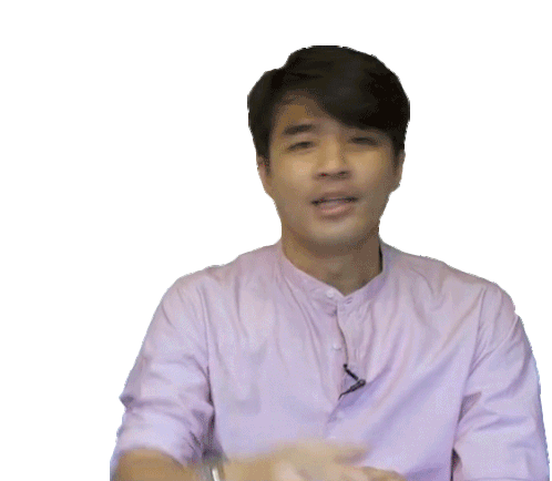 a man in a pink shirt is laughing and pointing at the camera