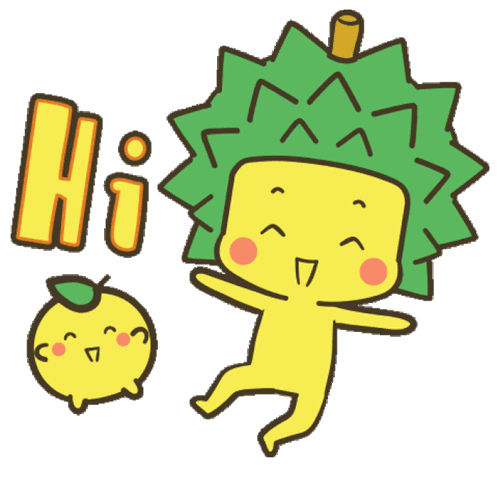 Durein Durian and a small fruit friend wave hello with a cheerful 'Hi' in this adorable animated sticker.