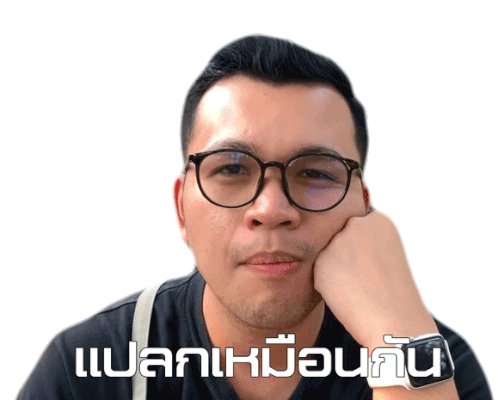a man wearing glasses has his hand on his chin and a sticker that says ' แปล ' on it