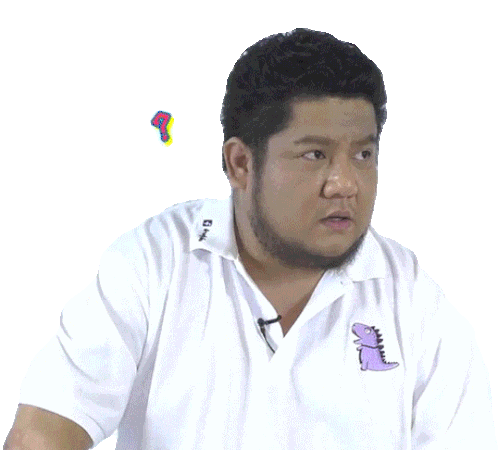 a man wearing a white shirt with a purple dinosaur embroidered on it has a question mark above his head
