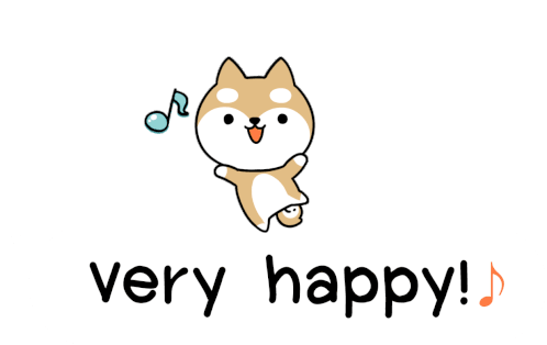 A cute, happy Shiba Inu dog animatedly sings 'very happy!' with a musical note, expressing pure joy.