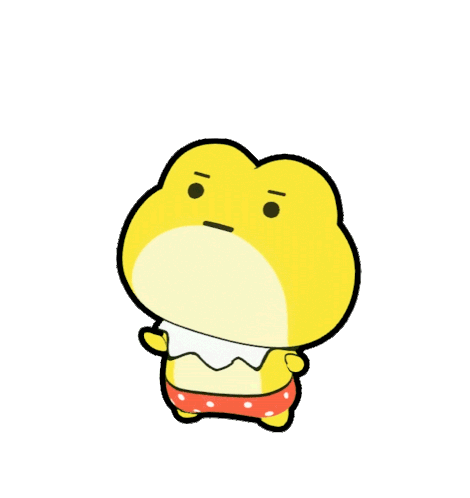 A cute yellow frog character exclaims "I-ye-i!" with excitement, surrounded by red dots, conveying joy and happiness.