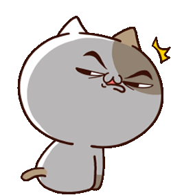 A cute cartoon cat with a large head gives an intense, annoyed stare, questioning "What?". Its expression shifts from grumpy to disgusted.