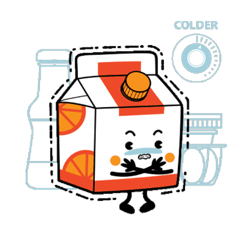 An anthropomorphic orange juice carton shivers and sneezes, feeling cold, with 'COLDER' visible in the background.