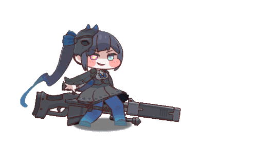 트릭컬 리바이브의 시온이 거대한 저격총을 들고 조준 후 미소 짓는 애니메이션 스티커.