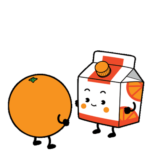 Animated cartoon orange and orange juice carton high-five with excitement, celebrating a happy moment.