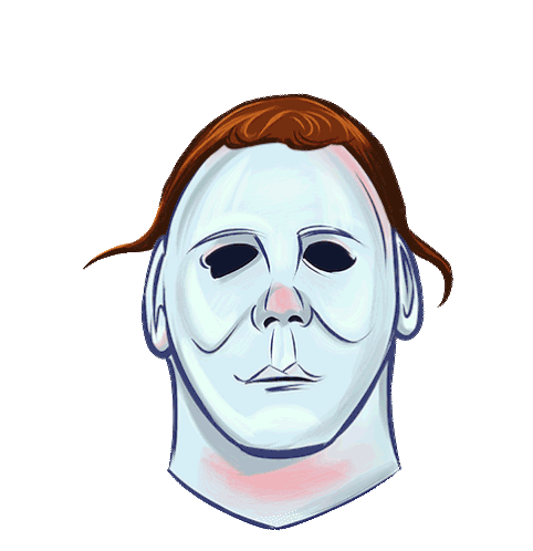 Michael Myers' iconic mask is paired with various hair transformations, from spiky to long to a man bun, in this animated sticker by Travis Falligant.
