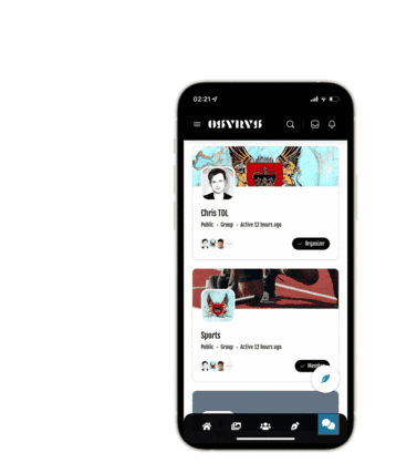 Animated sticker showing the Osyrys social network app interface on an iPhone, highlighting group features and user profiles.