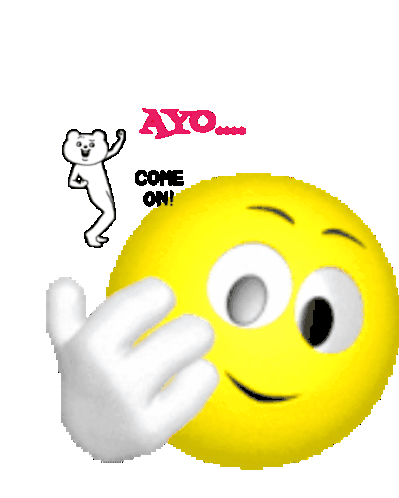 A yellow smiley face with cartoon hands and a dancing bear encourages with 'AYO... COME ON!' text.