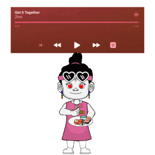 a cartoon of a girl holding a plate of sushi next to a screen that says get it together zhot
