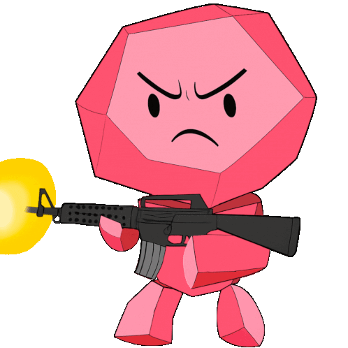 a cartoon character with an angry face is holding a gun and a yellow ball