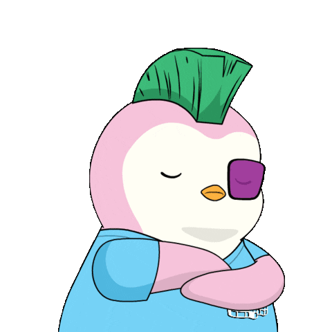 A pink penguin with a green mohawk and purple monocle makes a dismissive "stop" gesture, conveying "I'm done" or "forget it".
