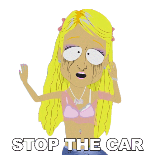 A South Park caricature of Paris Hilton, with tears and mascara running, dramatically demands "STOP THE CAR."