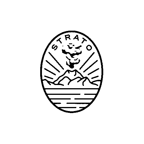A stylized black and white sticker featuring a volcano erupting, with its smoke forming the arched word "STRATO" above it.