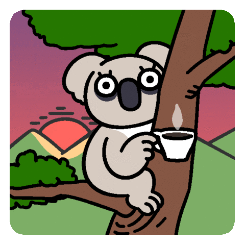 A weary koala with dark circles under its eyes sits in a tree, holding a steaming cup of coffee, perfectly capturing a stressed and tired mood.