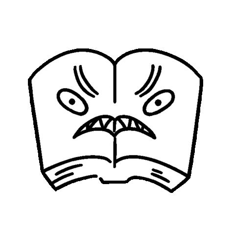 An animated sticker of an open book with an intensely angry face, furrowed brows, jagged teeth, and a lightning bolt.