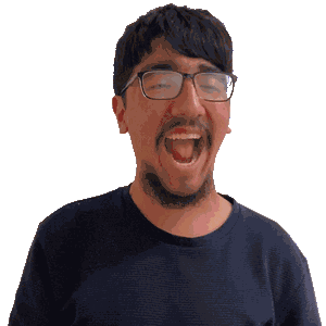 a man with glasses and a beard is laughing and sticking his tongue out