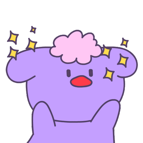 A cute purple blob character with a pink cloud on its head looks amazed, surrounded by sparkling stars.