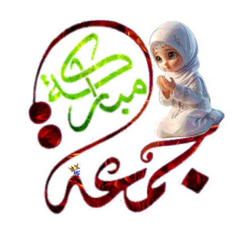 A cute cartoon girl in a white hijab kneels in prayer next to vibrant Arabic calligraphy for Jummah Mubarak.