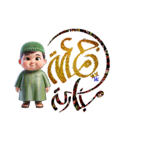 A cute cartoon boy in a green thobe and kufi stands next to "جمعة مباركة" (Blessed Friday) calligraphy by Tawfikiya.