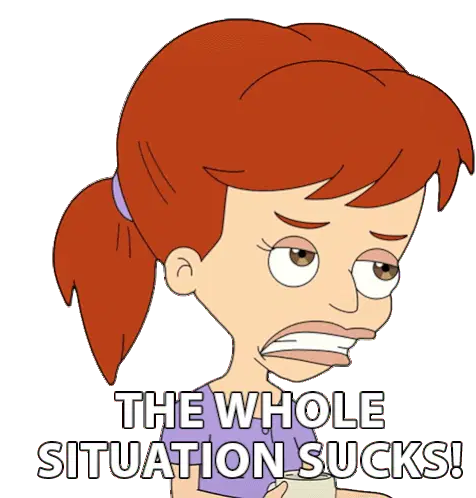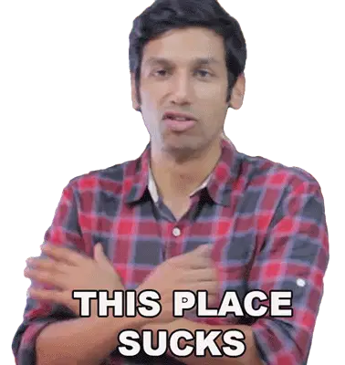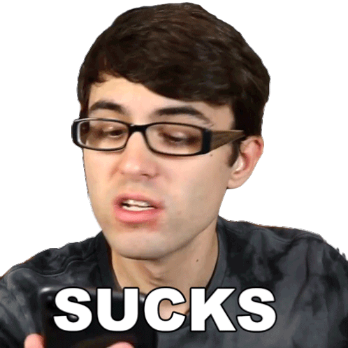Steve Terreberry reacts with a disgusted expression, holding a phone, with the word "SUCKS" displayed.