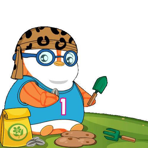 A Pudgy Penguin, wearing a bandana and jersey, is happily gardening, planting sunflower seeds with a shovel.