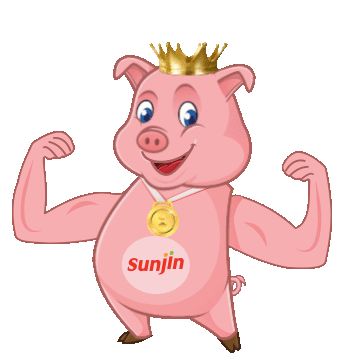 Sunjin No.1 pig character flexing its muscles, wearing a golden crown and medal, sparkling with strength and pride.