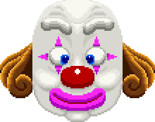 a pixel art of a clown with a red nose and pink lips